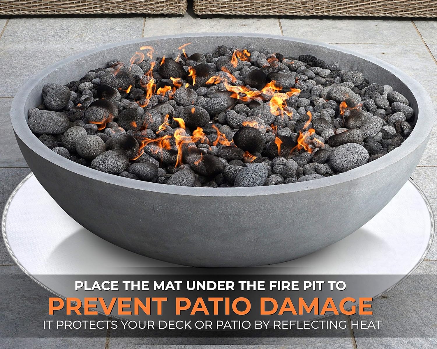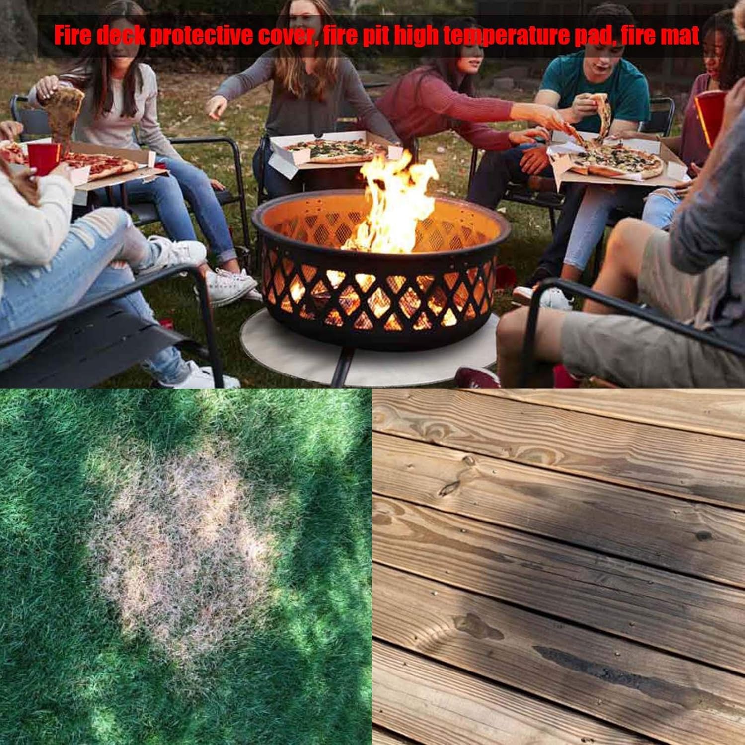What is a fire pit grass protector? Place a fire mat under your pit to protect your grass. Deck defender & grass guard protects your wood deck, composite deck, patio or lawn from the extreme heat created by portable wood burning fire pits and chiminea's. This is particularly important when using pavers. Composite wood), lawn or concrete surfaces see below;